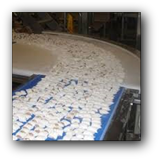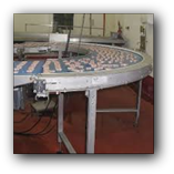 Fabricación y montaje de transportador en curva a 90°de banda modular alimentaria de radio mínimo para transporte de barras de pan en Ind. Panificadora.